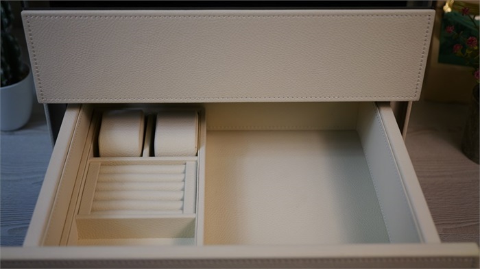 Два выдвижных отделения, внутри одного есть съемный лоток для размещения ювелирных украшений. Лоток имеет мягкое внутреннее наполнение, которое обеспечивает дополнительную защиту украшений от царапин и повреждений.